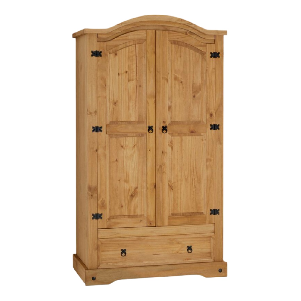 Armoire en bois massif avec porte double et tiroir, finition naturelle.
