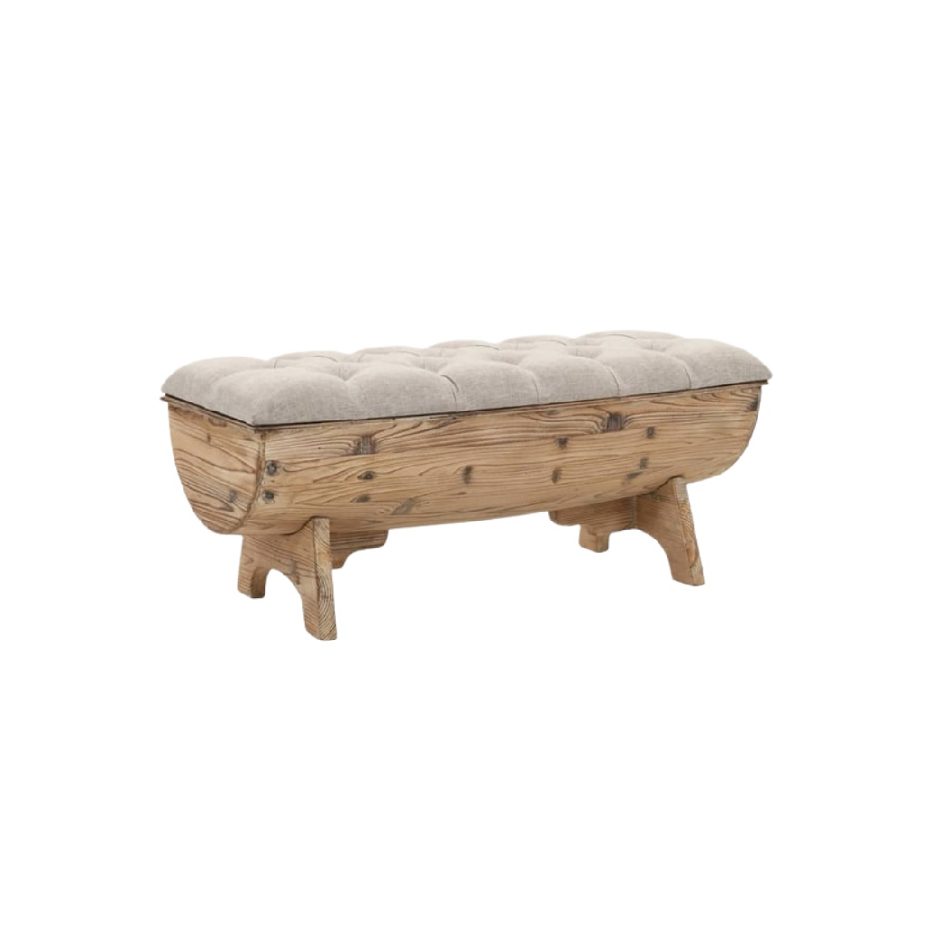 Banc en bois recyclé avec assise rembourrée en tissu beige - Style rustique et élégant.
