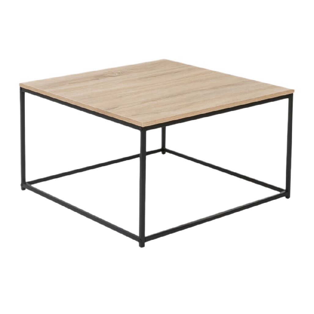Table basse carrée en bois clair avec pieds en métal noir.